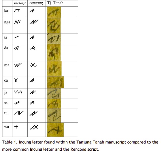 The Tanjung Tanah manuscript differs from the usual legal codes in that it is not written in jawi script, but in a Pallavo-Nusantaric script similar to the Old Javanese script, and probably related to the Malayu script of the Adityawarman inscriptions in West Sumatra.