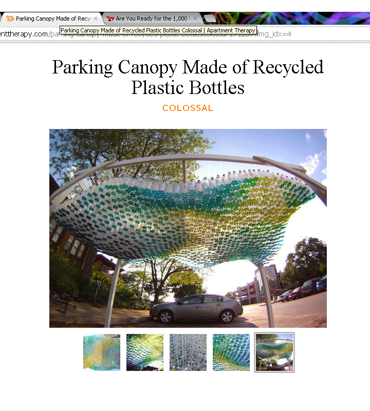 This is brilliant. Recycle bottle used as a canopy for cars. Very refreshing from Apartment Theraphy.