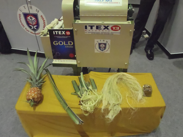 The material is made for pineapple leaves. You see in Johor, pineapple cultivation is a big thing. They do all these canning, exporting and are processed into canned food. But you have these leaves from pineapple. Not the pineapple, but these leaves that projected from the pineapple fruit.
