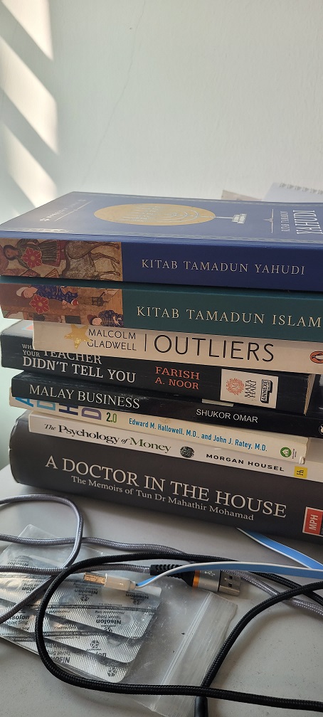 Selain daripada buku Medik, sempat juga luang masa membaca buku genre tertentu, American psychology (self help they call it) bulk of the ideas are American Organisational Psychology, Religion related; Islamic Renaissance, leader and history, HIstory, and Bibilography.